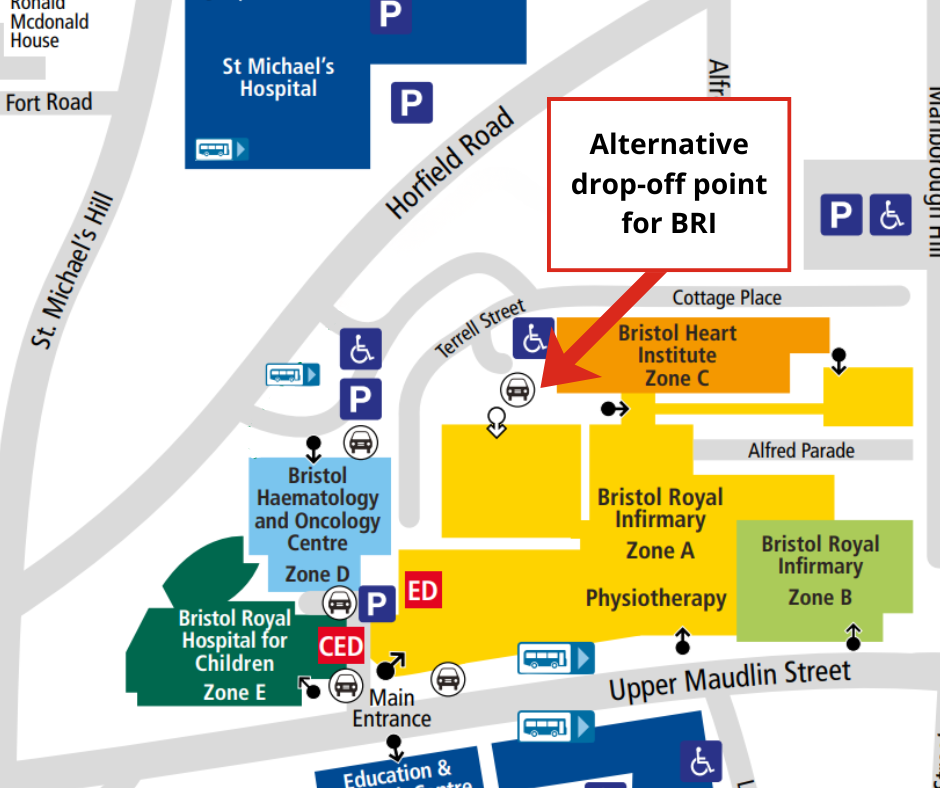 You can use the alternative drop-off area at the Bristol Heart Institute (BHI), via Horfield Road as shown on the map. Once inside the BHI entrance corridor, turn right at the bottom to access the Bristol Royal Infirmary.